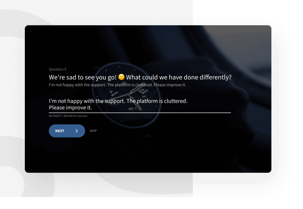 Uncover the reason behind the exit of a customer. Improve those shortcomings and lower your customer churn rate. Share customer exit surveys after each churn.