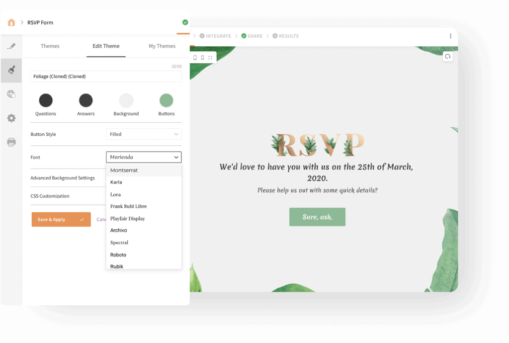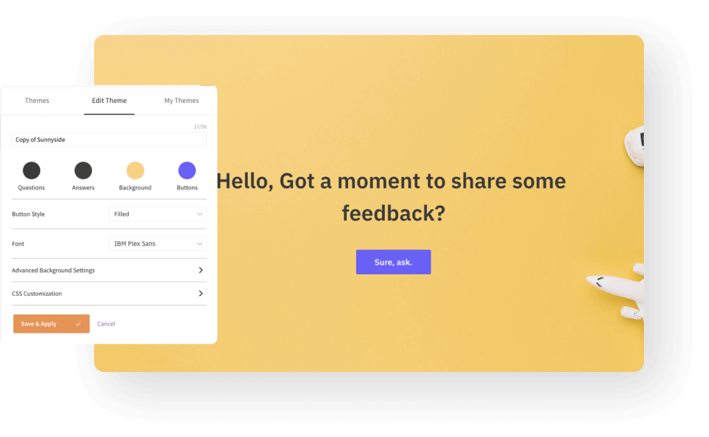 With survey themes, add life to your surveys. Design everything about your survey- background, buttons, color palette, font. Go that extra mile using CSS customization to style the surveys you create to perfection.