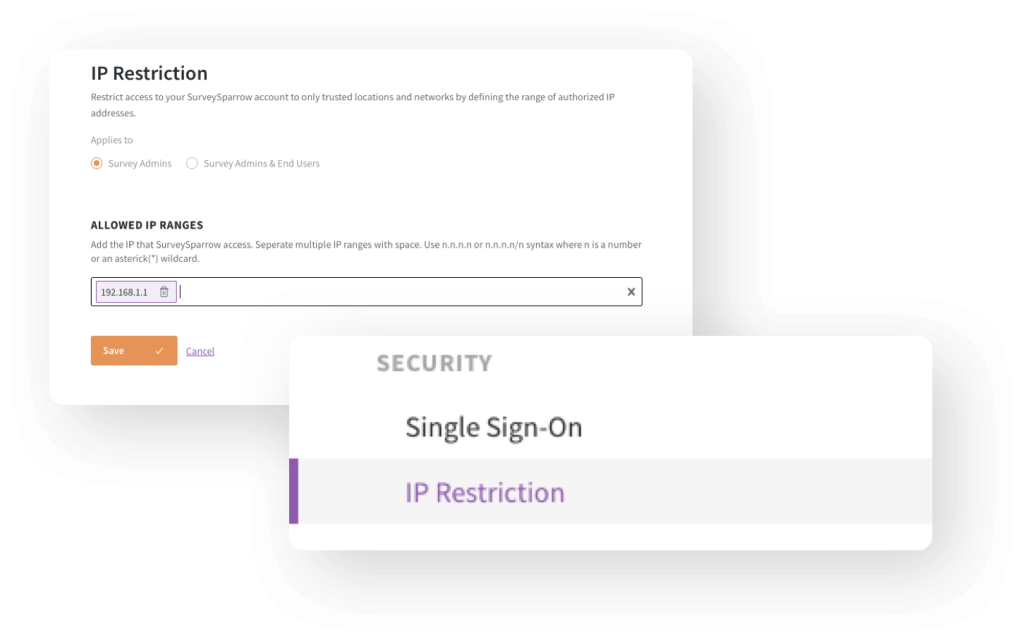 Allow only trusted locations or networks to access your SurveySparrow account. You can apply these restrictions to both survey admins and end-users. Provide access to only trusted sources.