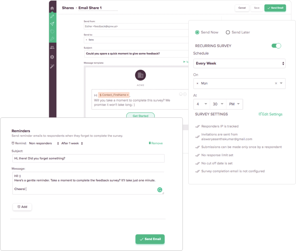 Automate the process of sharing periodic surveys. Set the time, date, day, and the frequency at which you want the surveys to be sent.
