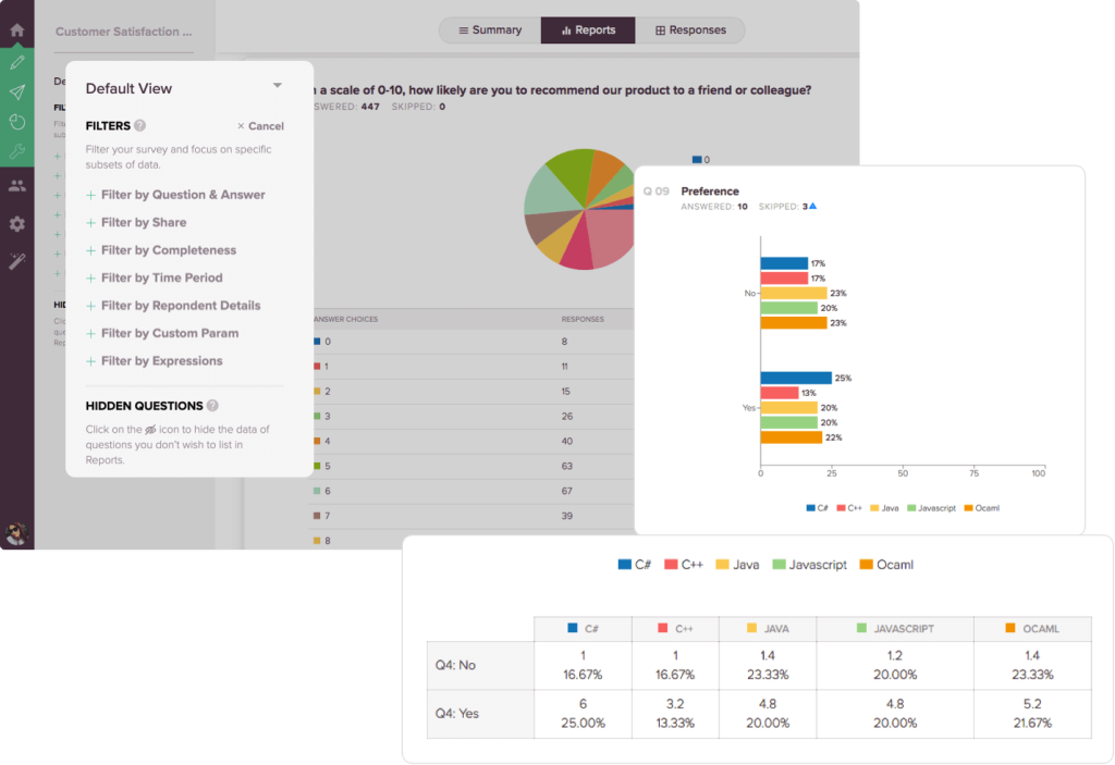 • Get insightful reports by filtering and comparing responses