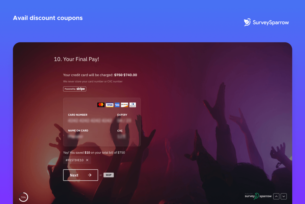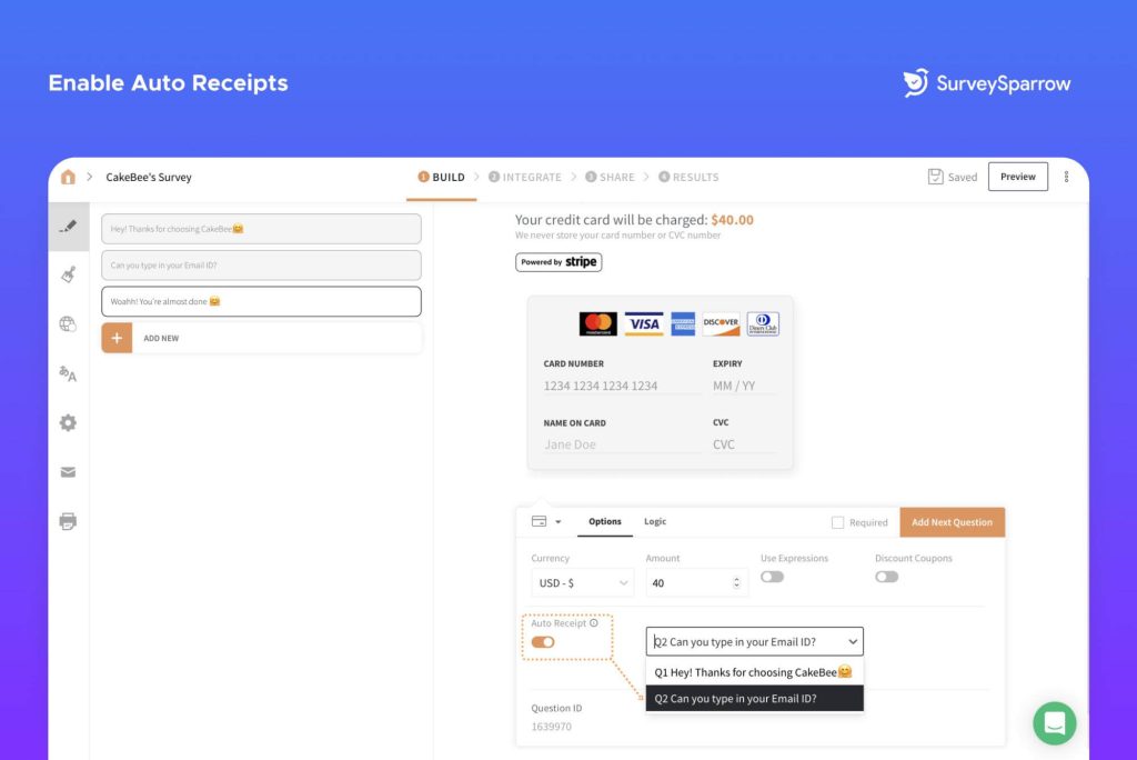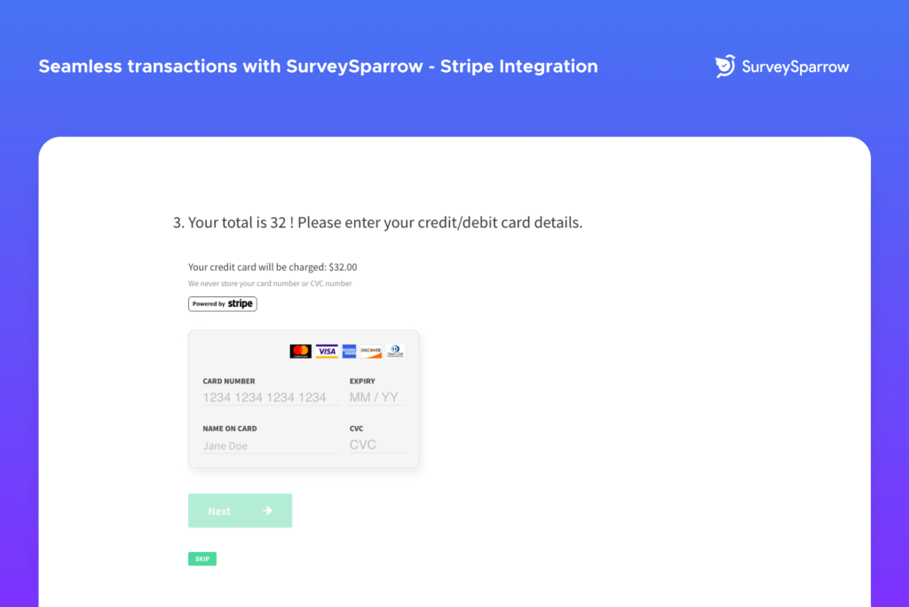 Stripe Integration with SurveySparrow lets you collect payments or donations from respondents via credit/debit cards through your survey forms. From making the payments online to securely collecting the purchase amounts, and managing your transactions efficiently, the Integration has got you all covered.