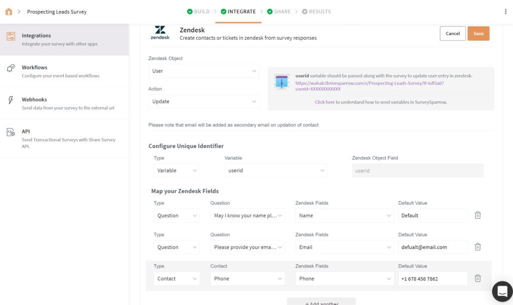 Choose the Zendesk Object and Action from the dropdown and map your survey responses to the corresponding Zendesk fields. Now when your survey is shared and starts getting responses, a new contact is created on Zendesk, in real-time.