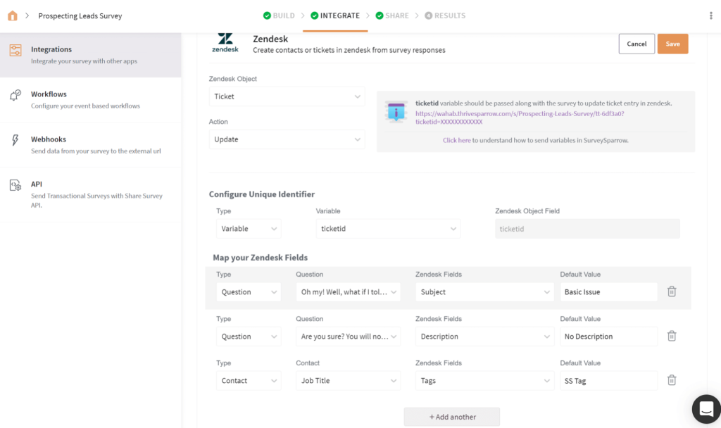Note: The variable ticket_id should be passed along with the survey to update ticket entry of Zendesk.